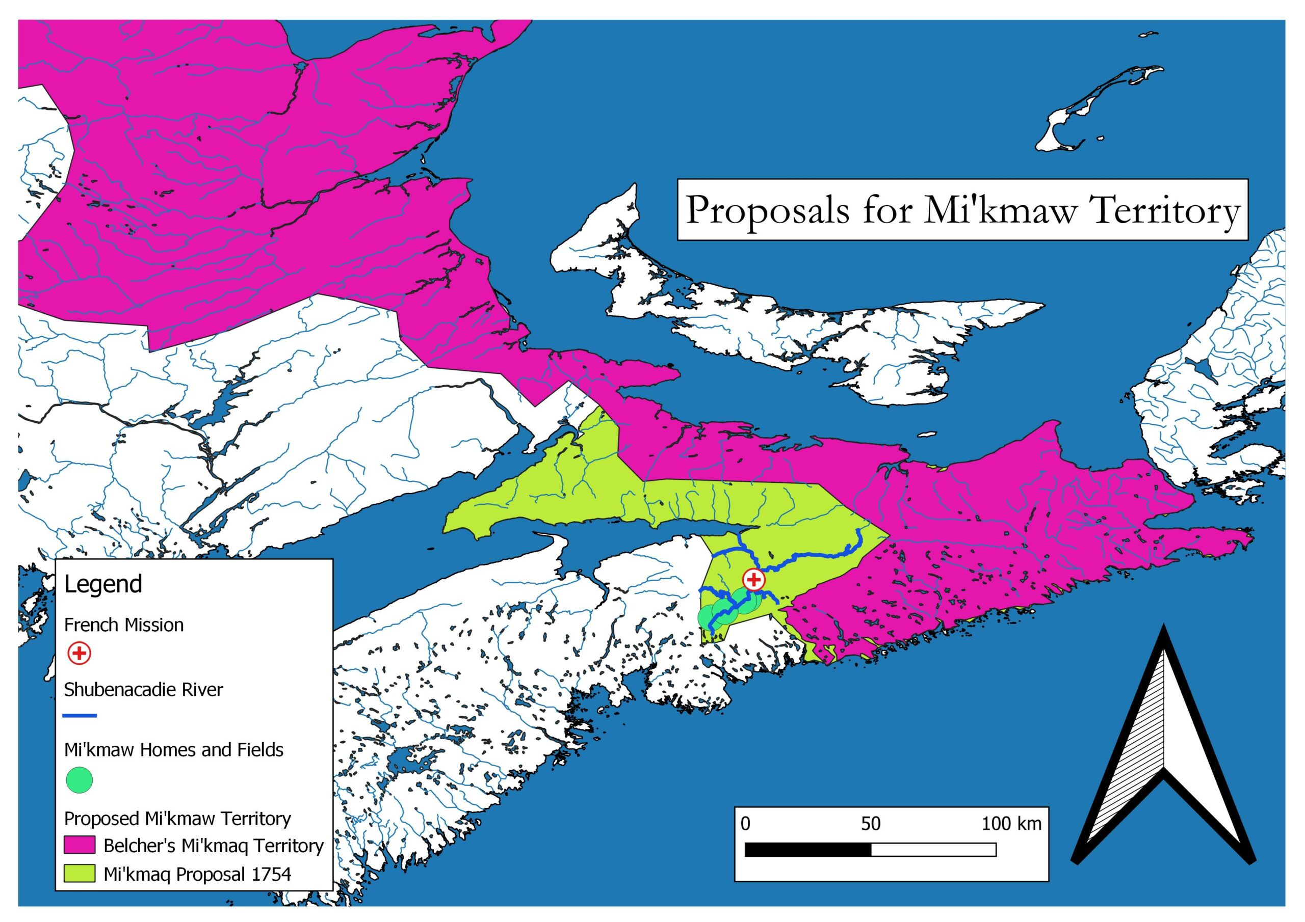 In 1754, amidst renewed tensions between the British and Mi’kmaq, Mi’kmaw leaders sent the British a letter outlining their conditions for peace. Among their demands was a desire for exclusive jurisdiction to a territory that stretched from Beaubassin to Minas, up the Shubenacadie River and down the Musquodoboit to the Atlantic coast, along the Atlantic coast to Canso and along the Northumberland Strait back to Beaubassin (Baye Verte).[4]